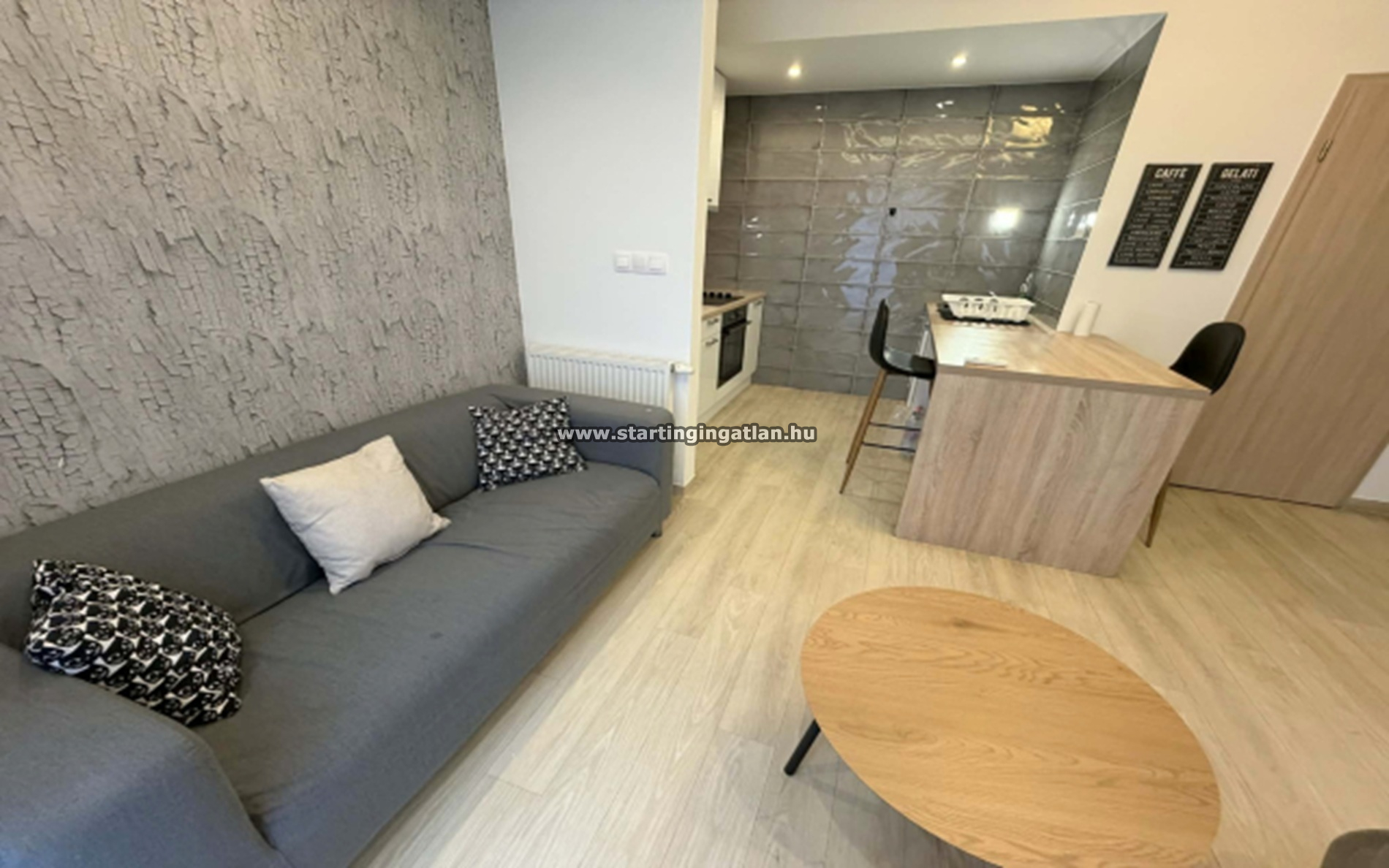 A világos, amerikai konyhás nappali harmonikusan egyesíti az étkező- és pihenőteret, a hálófülke pedig intimebb, elkülönült kuckót biztosít a mindennapokhoz. A zuhanyzós fürdőszoba és a külön helyiségben található WC praktikus elrendezést kínál.