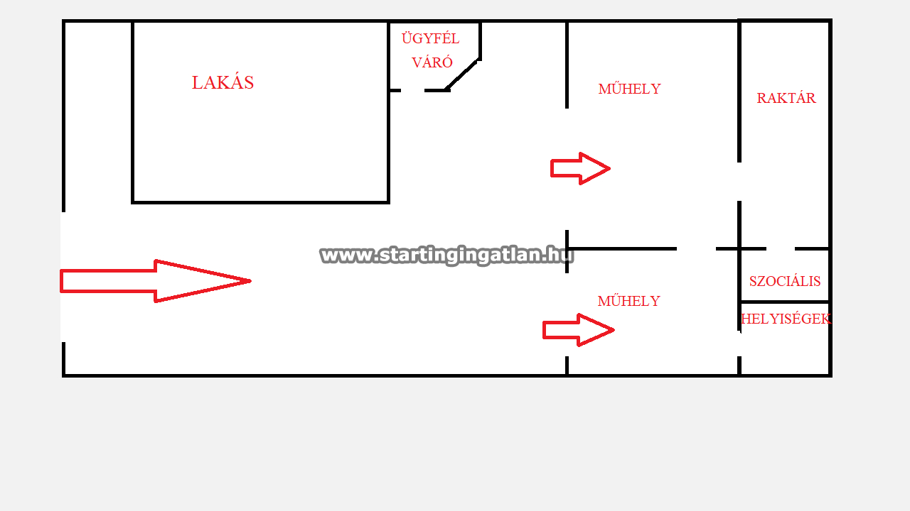 A műhely helyiségei:1 db aknás beálló (28,9 m²) és 1 db küszöbemelős beálló (17,4 m²) kéziműhely (16,4 m²) raktár (5,8 m²) váróhelyiség (9 m²) fürdő és WC (2,25 m²) iroda (5 m²)